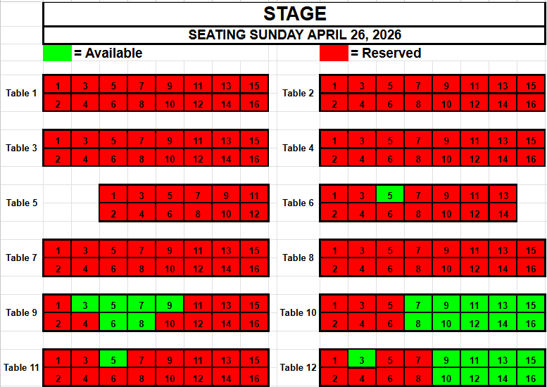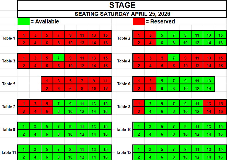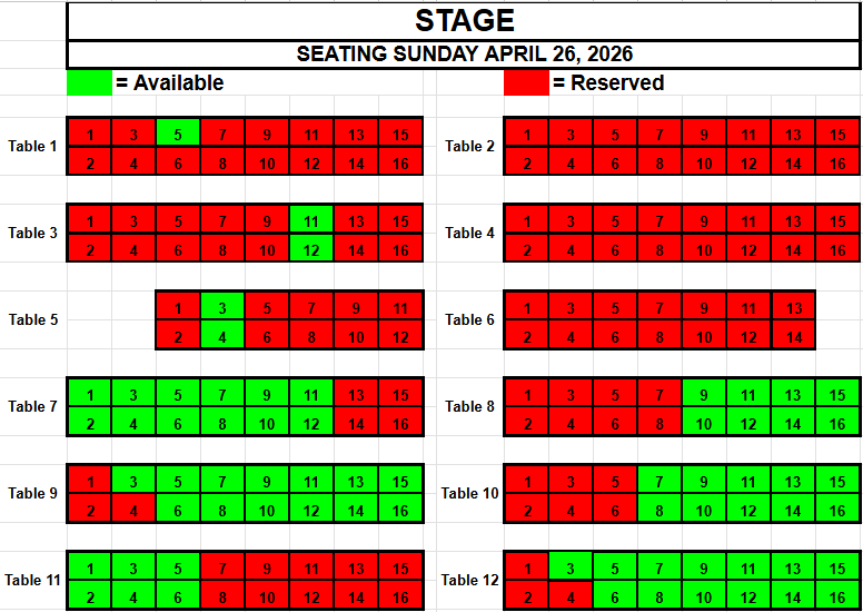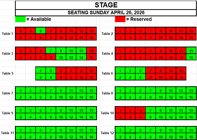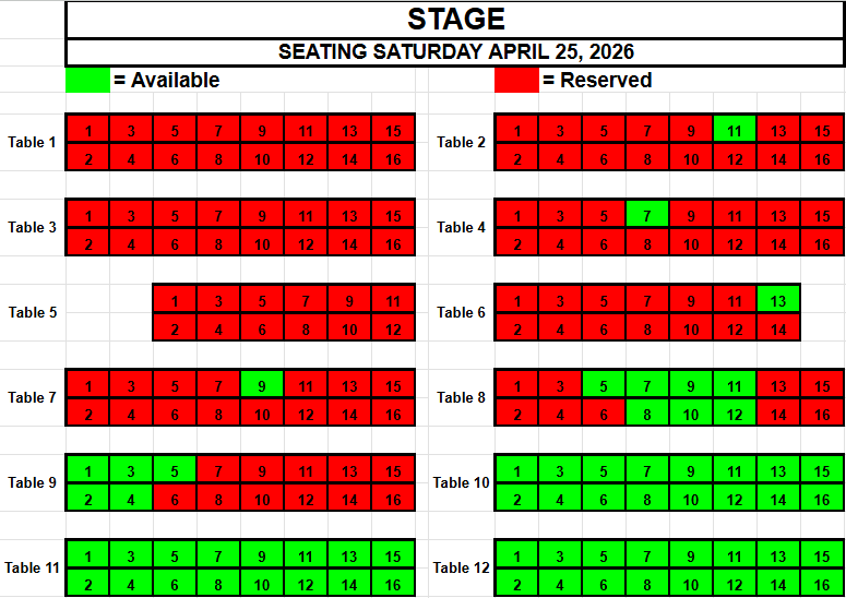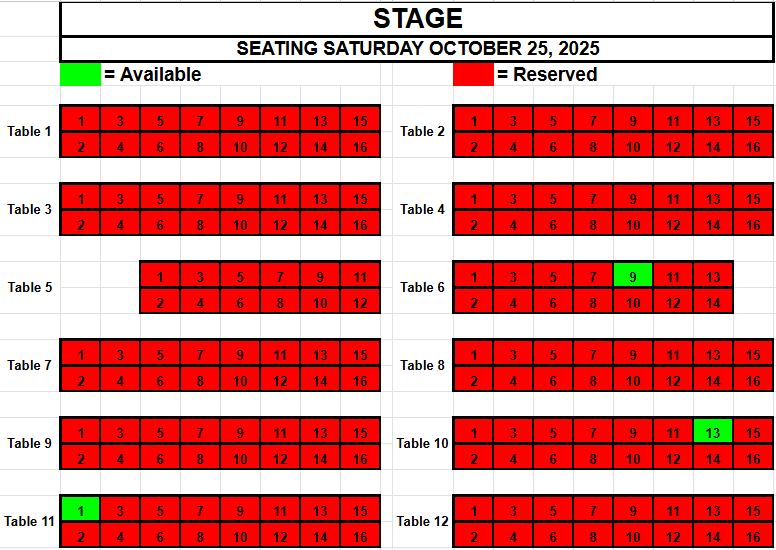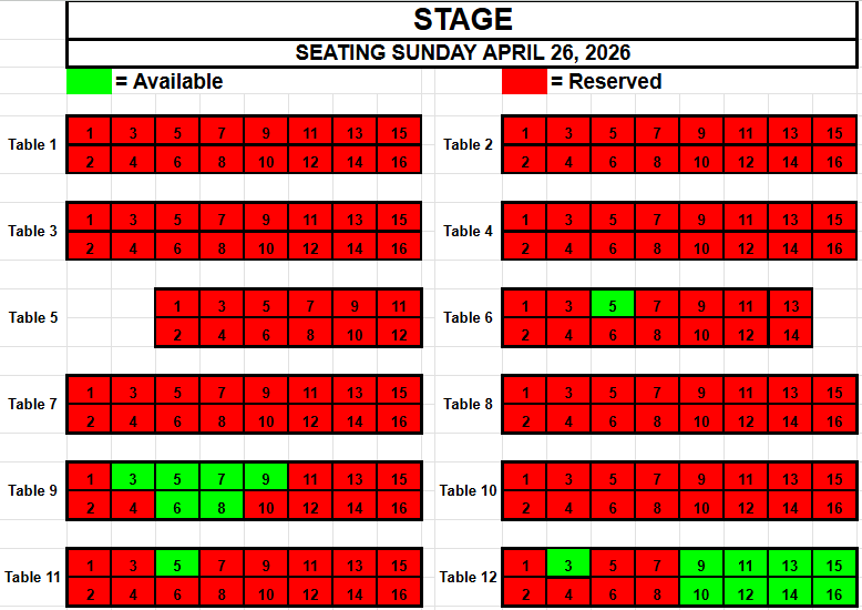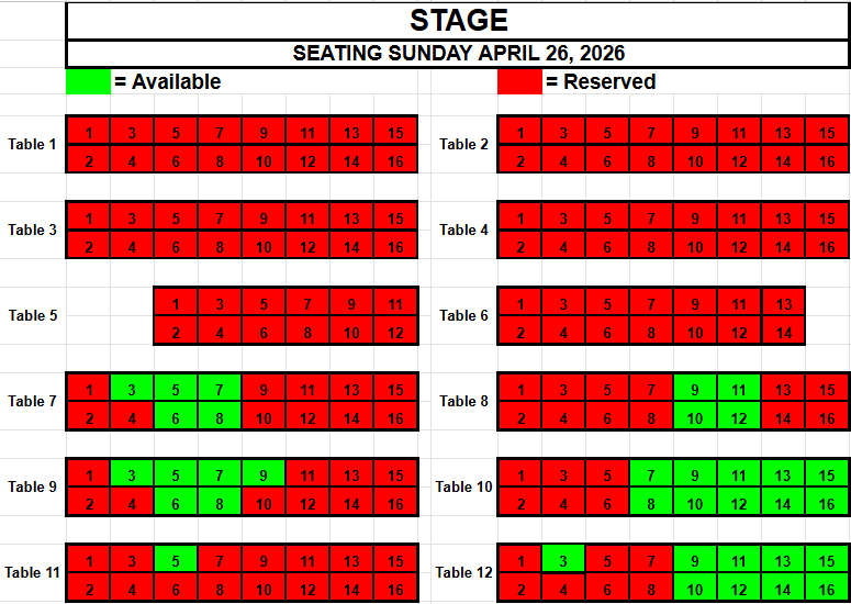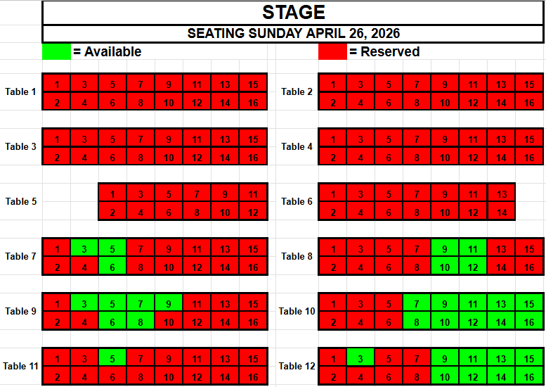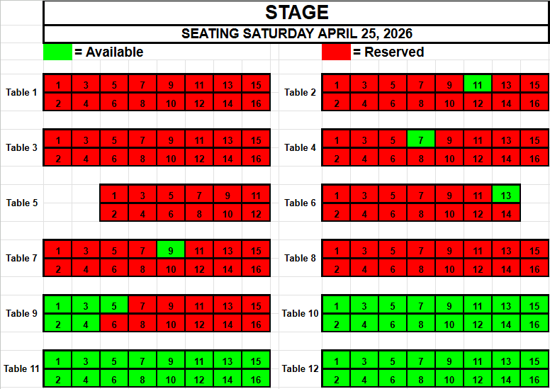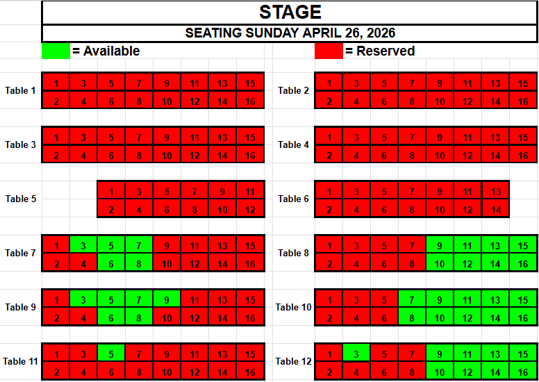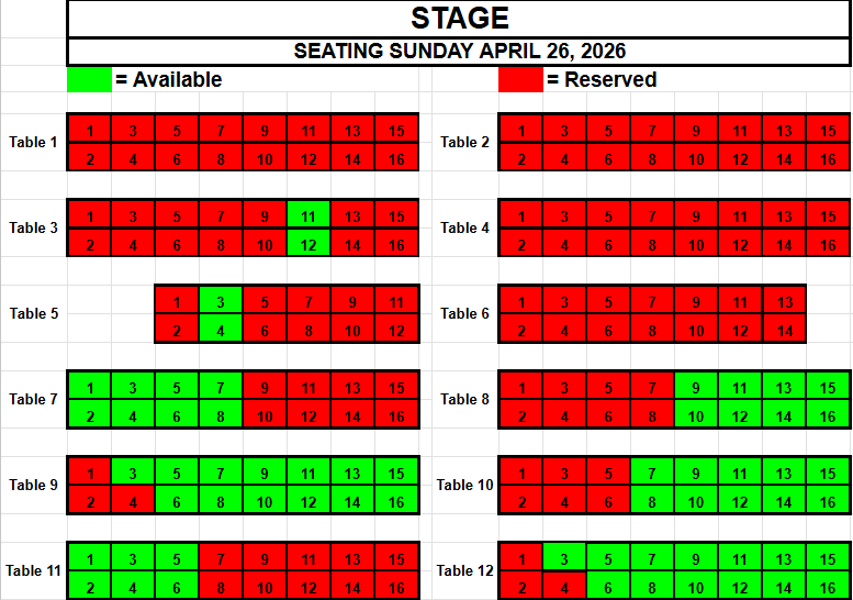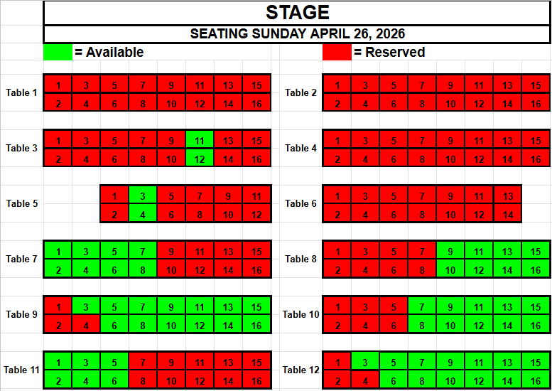 If you wish to request seating, please view the seating below for availability. Make a note of the Date, the Table and the Seat(s) you want and send an email to TracadiePlayers@gmail.com and leave your Name, Phone Number, Email Address and Request.