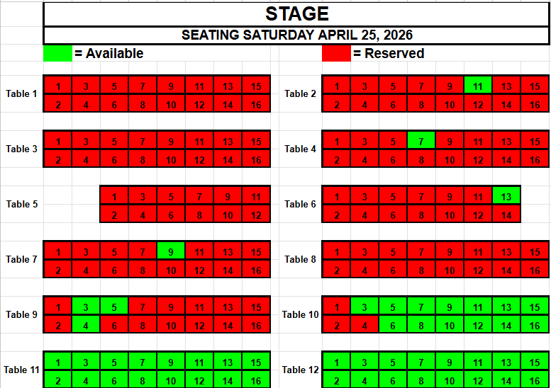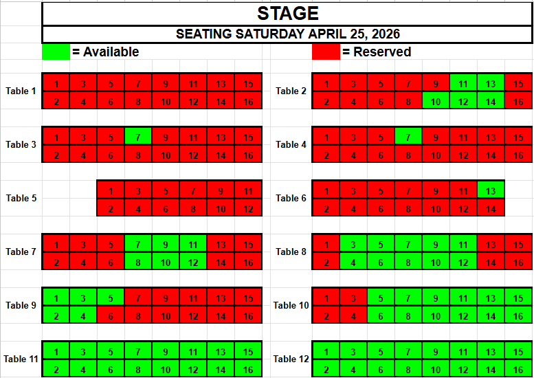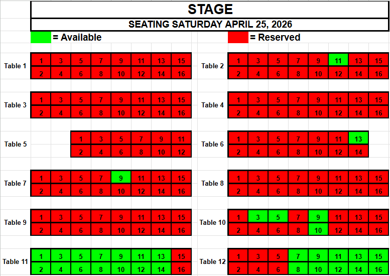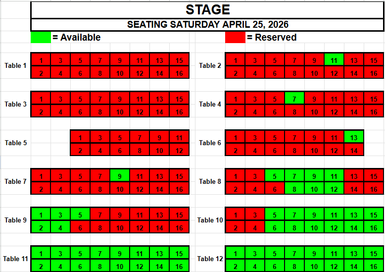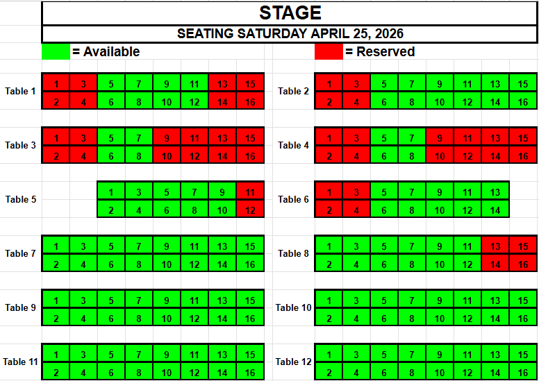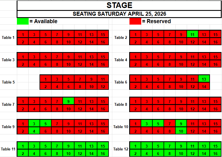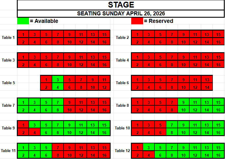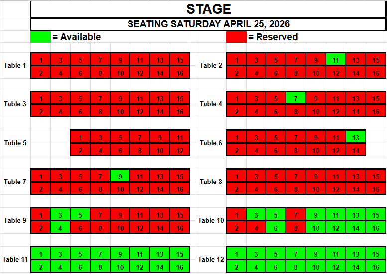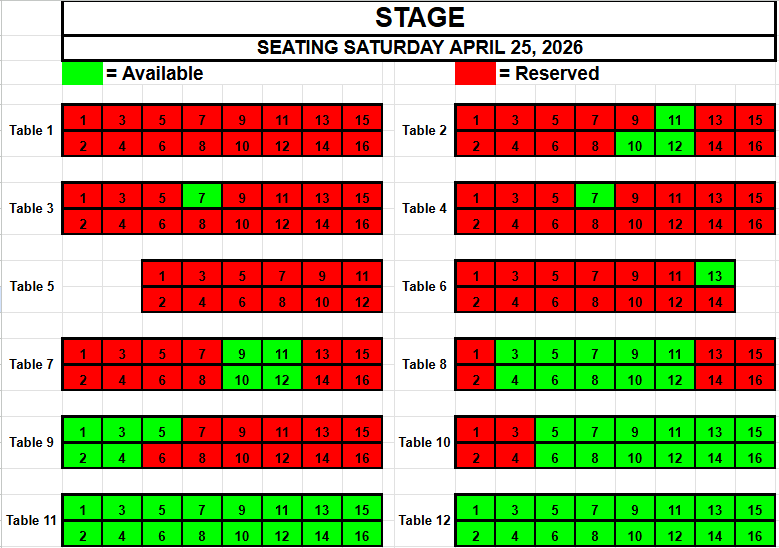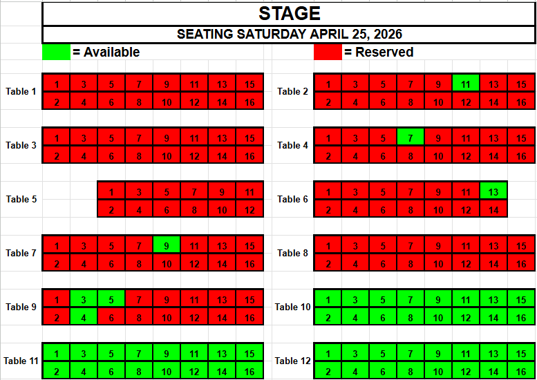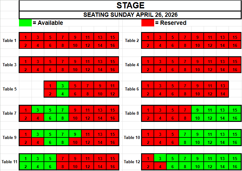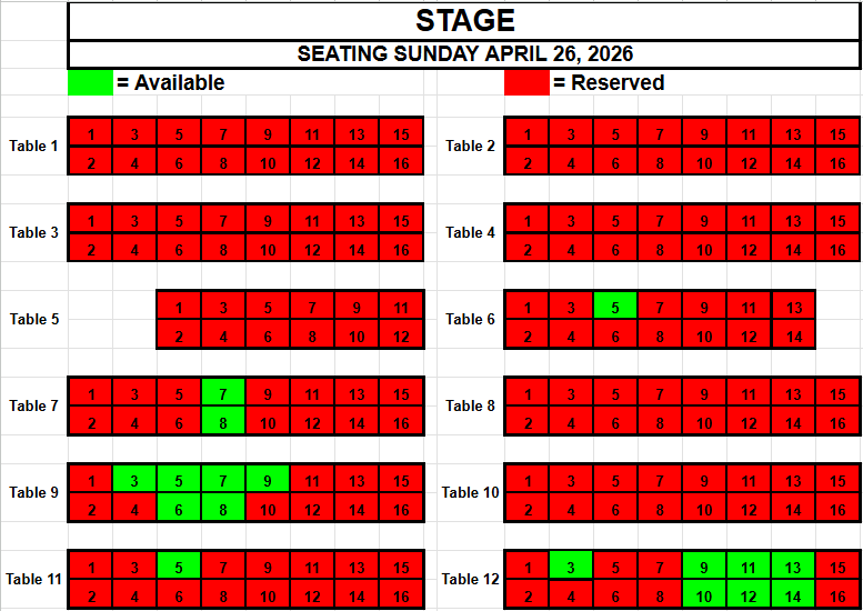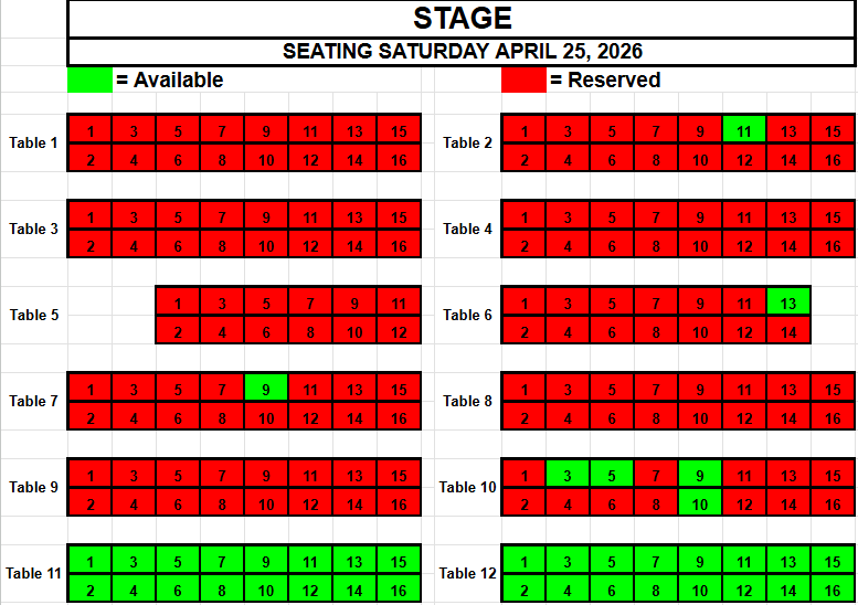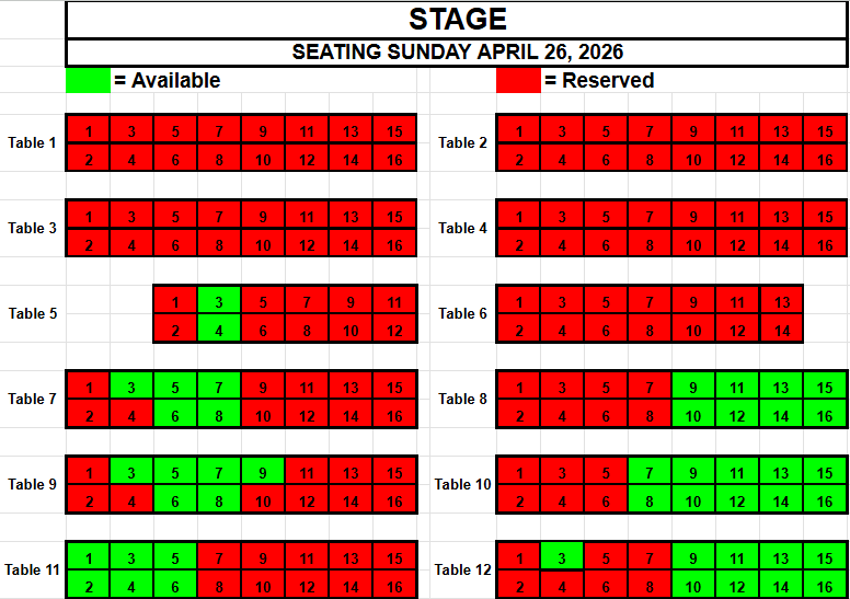If you wish to request seating, please view the seating below for availability. Make a note of the Date, the Table and the Seat(s) you want and send an email to TracadiePlayers@gmail.com and leave your Name, Phone Number, Email Address and Request.