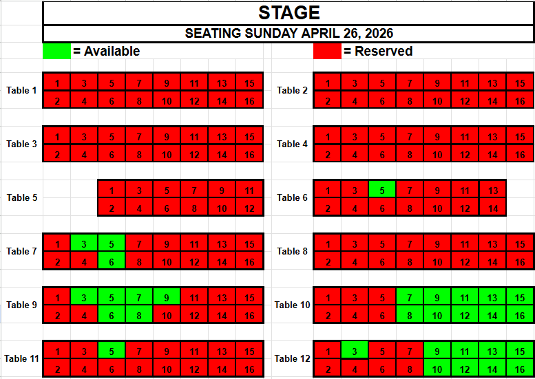 If you wish to request seating, please view the seating below for availability. Make a note of the Date, the Table and the Seat(s) you want and send an email to TracadiePlayers@gmail.com and leave your Name, Phone Number, Email Address and Request.